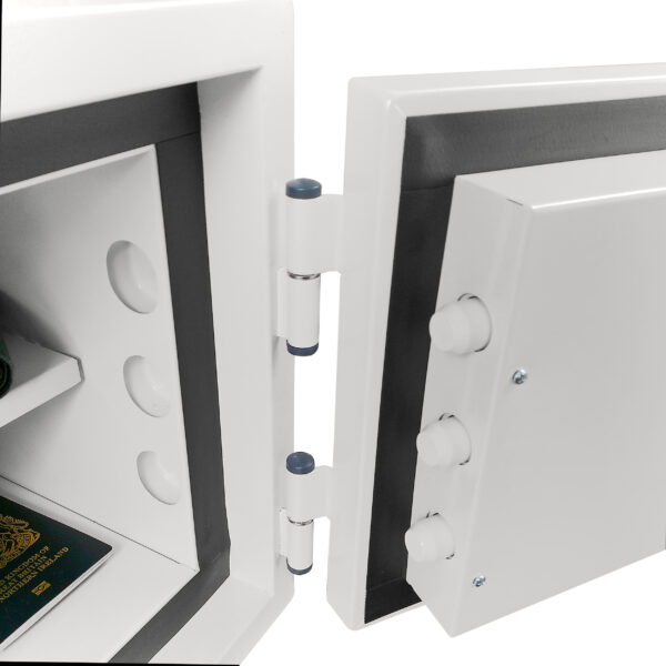 Produced in steel with a double wall construction and high grade concrete infill to provide both fire and burglary protection. Its hidden anti-drill plates and 3 way live locking bolts. Besides its fixed hinge side dog bolts offer excellent protection in case of serious attack.