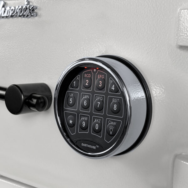 Fitted with a high security VdS certified, electronic code lock with top light to illuminate its key pad. In addition, it features an impact resistant polycarbonate housing. The user code is programmed via its master code.