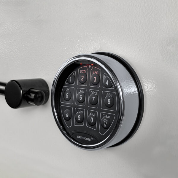 Fitted with a high security VdS certified, electronic code lock with top light to illuminate its key pad. In addition, it features an impact resistant polycarbonate housing. The user code is programmed via its master code.